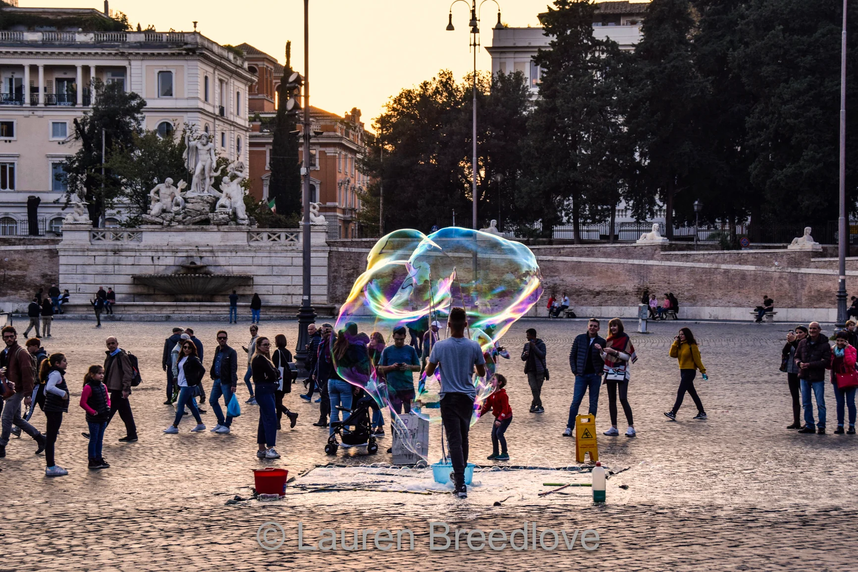Not in a creepy way. Rather, a ‘find a spot to park it in a piazza and do some good ole fashioned people watching’ kind of way. There’s a plethora of piazzas and even more people to observe. As a New Yorker, we not only enjoy people watching, but also have abundant opportunities to do so. Turns out, Rome is also an optimal place to engage in one of our cherished low key activities. People aren’t the only things watch; piazza goings-ons are superb entertainment in general. There’s almost always live street music, a bubble guy, and majestic fountains.